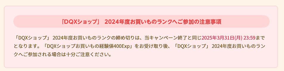 このビットキャッシュのキャンペーンの期間が2025年3月31日の午後11時59分までであることを鑑みますとこのキャンペーンで貰えるDQXショップのお買い物経験値400Expのアイテムは4月以降も使用可能であると考えるのが妥当です。