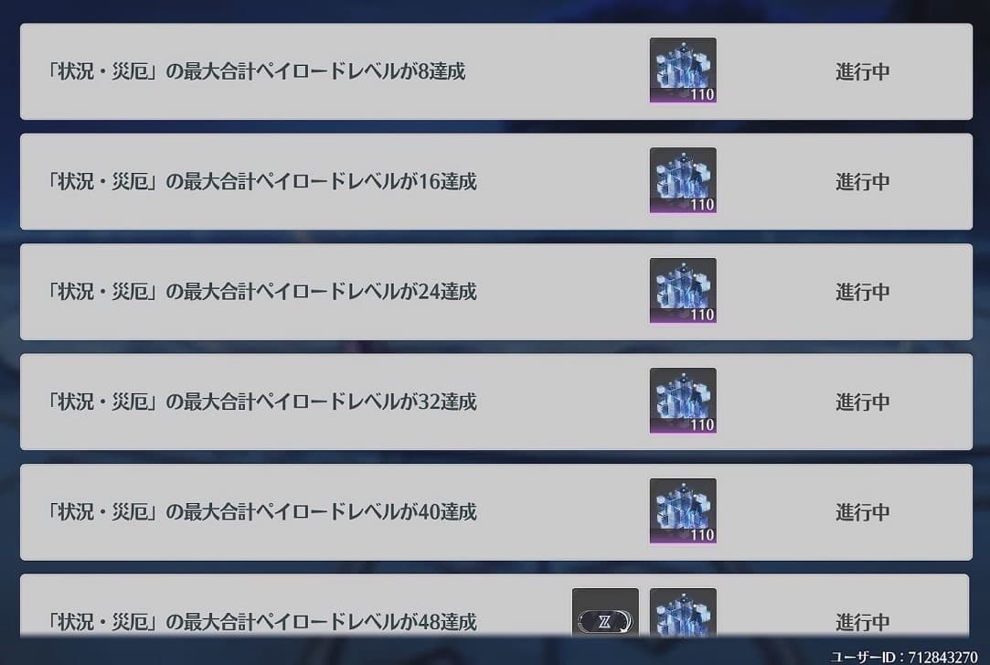 状況・危機がクリアできたので次は状況・災厄となります。こちらは自分でバフを盛れるだけ盛ってペイロードレベルを上げることで貰える報酬を増すことが出来ます。こちらで貰える報酬はこのイベント用の通貨の星図クリスタルと称号なります。石は直接貰うことは出来ないのでスルーでもおkなのかな。