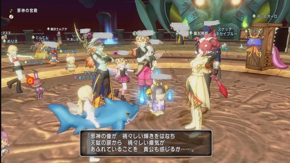 午前12時ころにログインしてまず遊ぶのは先々週から始まったみんな大好きトラシュカです!…と思っていたらなんと会場へと向かう途中で天獄が開いたとのアナウンス。うーむせっかく水着に着替えて浮き輪まで装備してきたのに…しかしこれは開幕乗り込めー!のチャンス。急遽予定変更!邪神の宮殿の天獄で遊ぶことにしました。