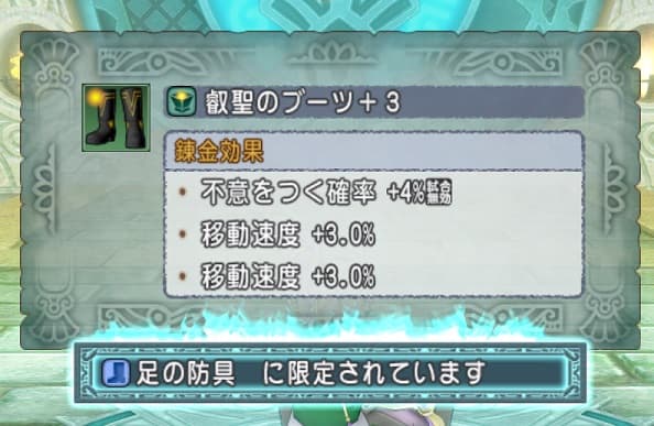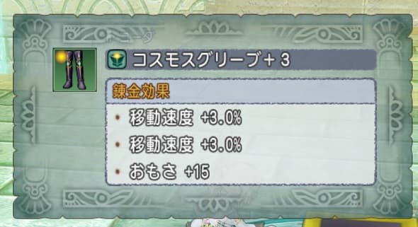 コスモスブーツの移動速度6%。ヨロイは魔衛隊士からの買い替えを検討中ですがコスモスシリーズはどうにも気が乗らなくて忌憚なく言えば全く買いたくない。欲しくない。コスモスだけは絶対嫌だ。でも魔衛隊士はさすがに古すぎるし…悩みます。