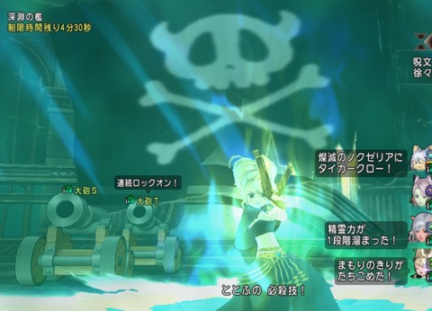 ウルトラ大砲はフィールドに出ている時間が約40秒、その40秒以内にパニックキャノンを使うと更に40秒存在させ続けることが出来ます。左上の時計とにらめっこしながら大砲を撫で撫でしつつパニックキャノンで更新…海賊はローテの関係か燦滅爆雷とか連撃、パラライズ以外のターゲットにはなりにくいので戦闘中無我の境地と言いますか近接職で戦っている時とは全く違う時間軸で戦っているような不思議な感覚になります。