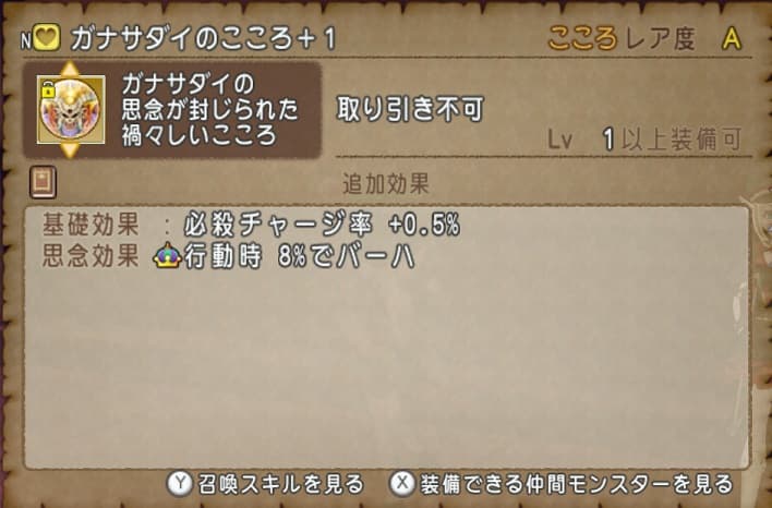 今回のガナサダイのこころは当たりなのかな。行動時8%バーハはノクゼリアで有用みたいなことを言う人もいたようないなかったような。私はヒューザのバイシ7%を捨てる勇気はないですが。
