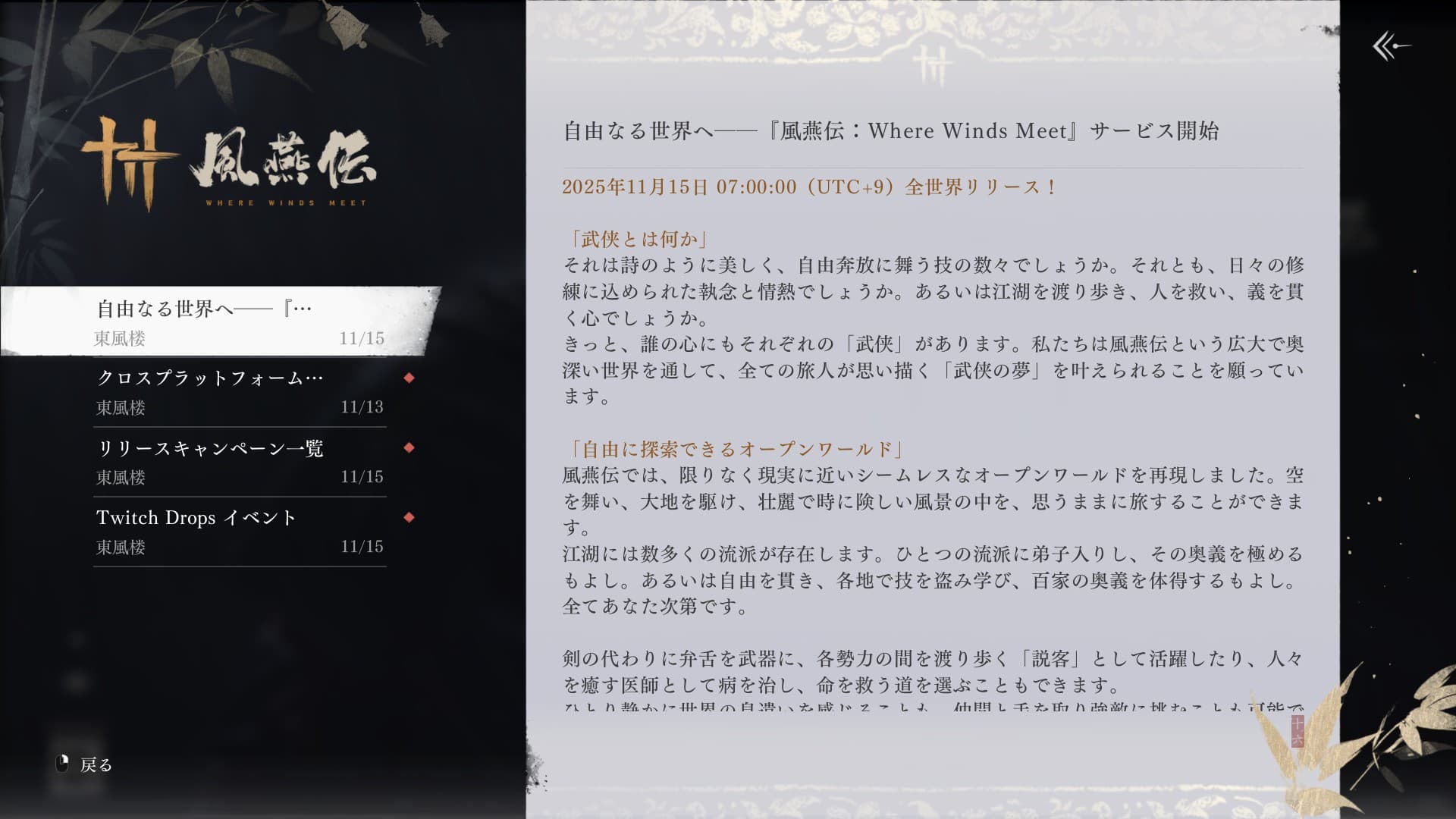 これで遊んだ基本無料ゲームは何本になるのかな。いい加減どれか1本に遊ぶゲームを決められれば良いのだけど面白そうなタイトルが一杯でつい目移りして手当たり次第遊んでしまいます。という事で今回遊んだのは″風燕伝:Where Winds Meet″というゲームです。