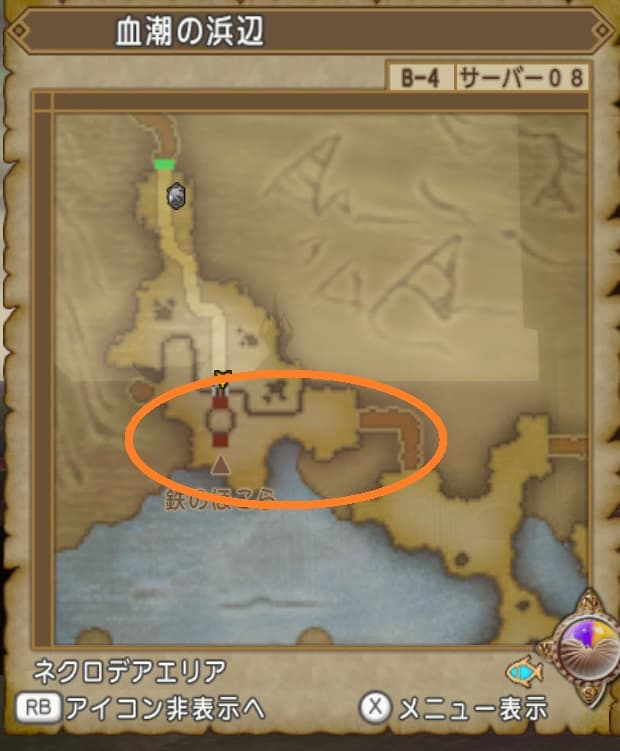 それ以外にも旧ネクロデア領⇨血潮の浜辺の南にある移動施設を利用した先のエリアにも生息しています。こちらも移動はアビスジュエルで行います。