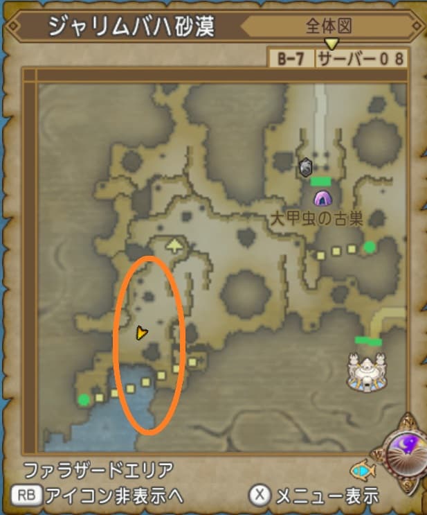 | ギガシュートの極意 闇の宝珠 | おばけヒトデ・強 | ジャリムバハ砂漠 血潮の浜辺 アビスジュエル | 1.砂漠南西の浜辺 2.南にある移動装置 を抜けた先 |