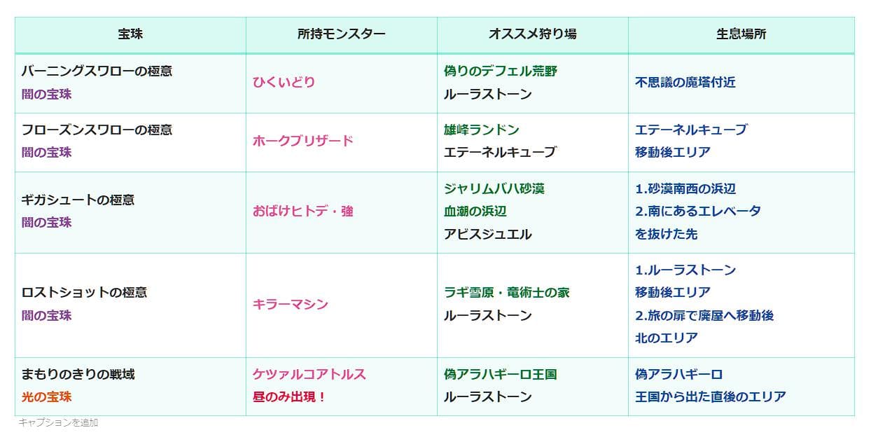 | 宝珠 | 所持モンスター | オススメ狩り場 | 生息場所 |