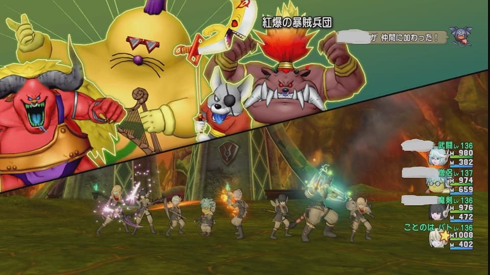紅爆の暴賊兵団と戦っていて驚くのが戦闘フィールド…遮るものも無くとにかく広い! この広いフィールドの前後左右に(後は無いか)敵が一郡を作って出現するので範囲攻撃はとても大事だと思いました。邪炎波とかランドインパクトとかマヒャドなどが活躍していましたね。