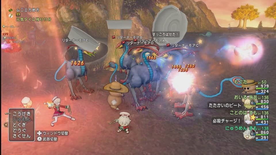 最大値の付いたソーサリーリングと忍耐+勝どきの宝珠のおかげで元気玉の効果時間30分の間にMPが切れることも全く無く(画像は元気玉残り時間1分の時のものです)、ただ1つのミスはエモノ呼びの咆哮をⅢにし忘れたことくらい。ちなみに私はリターナーモアは12匹最大値まで呼んでの狩りです…がこれが正しいという根拠は何もないです。