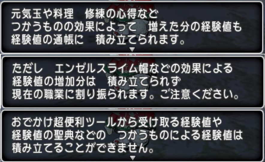 ちなみにエンゼル帽を使って経験値を多めに稼ぐ作戦はダメみたいです。エンゼル帽で稼いだ分の経験値は通帳には溜まらない仕様となっていました。まあ商売だしそうなるか。残念。他にも色々とルールがありますがそれはそうだろという物が多かったです。