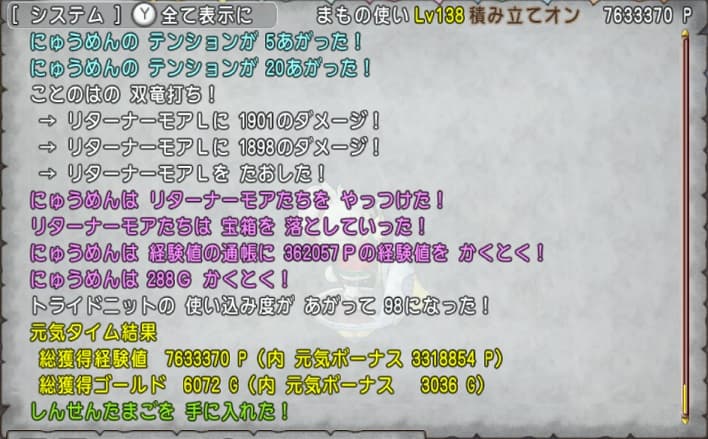 レベル138までの総獲得経験値がまもの使いの場合6600万。そして元気玉1個で稼げる経験値が820万。6600万÷820万=8.0。つまり元気玉8個、4時間でレベル1から138まで上げられるってことになる…え、レベルカンストってホントにこんなお手軽なの!? 俄には信じられないのだけど。でも計算ではそうなるんですよね…。