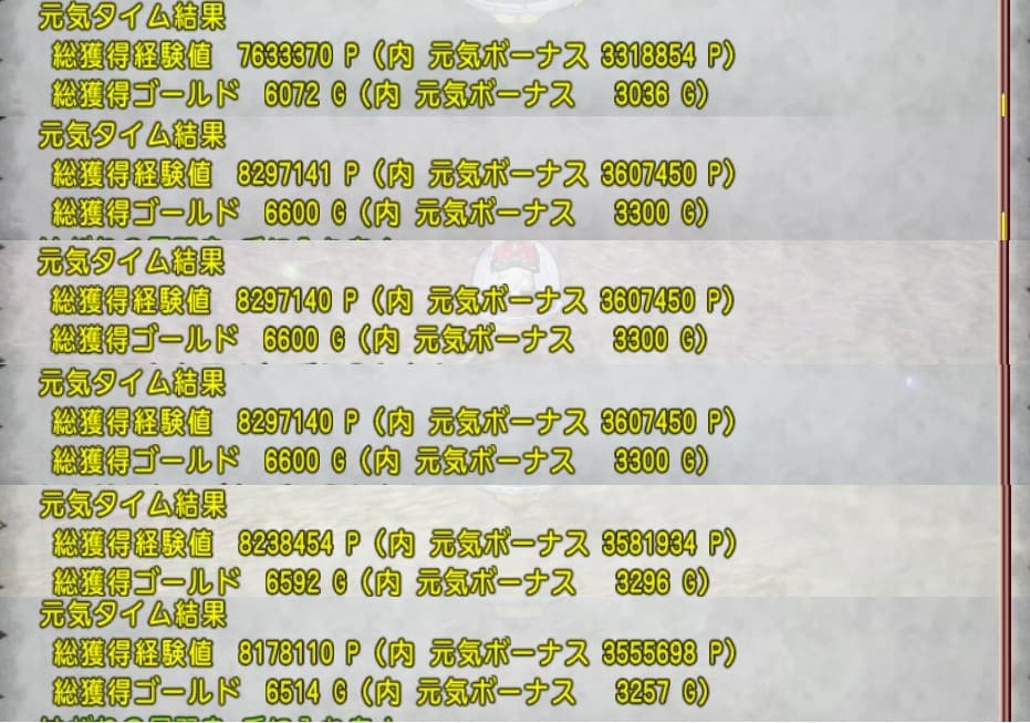 元気玉6個分の獲得経験値の画像です。820万くらいが獲得経験値の平均となっています。獲得経験値が全く同じ箇所がありますが偶然です。何度も確認しましたが全く別の元気玉の狩りで同じ数値となっています。まあ狩りの時間も12匹呼びのルーチンも全く同じですからこういう結果もあり得るのかも…自分でも驚きを隠せませんが。