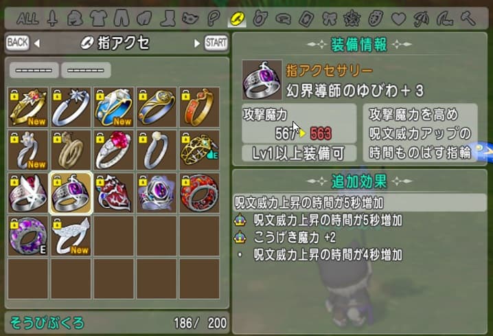 指輪なんて幻界闘士やら魔導将軍やら軍神のゆびわやら3世代全ての指輪が勢揃いしていて目障りったらありゃしない。これもきちんと作っていけば最終的には軍神系の指輪にひとまとめに出来るのです。
