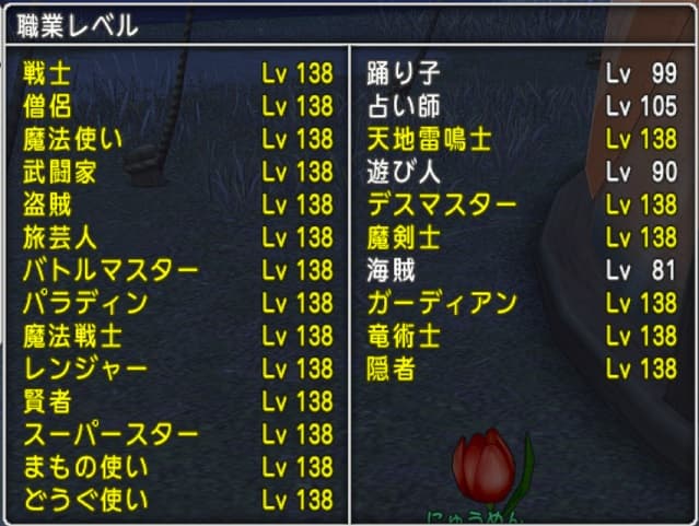 そもそも使う予定のない職まで上げるという判断がハッキリ言って下策でした…ていうかただただ愚か。使いたい職があるのならその都度レベル上げをすれば良かったんだ。もうあとには引けないので(なんで?)全職カンスト目指しますけど。