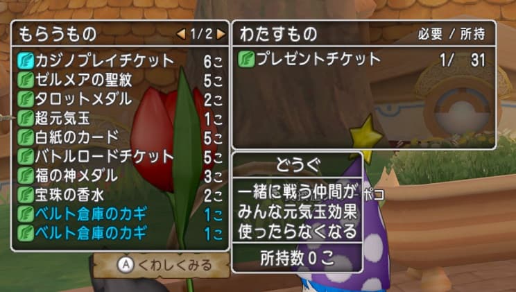 そこで問題となるのがプレゼントチケットの所持数です。レベル100から138まで上げるのに元気玉は7個必要なので7個×4職で28個。所持しているプレチケは31個なので必要個数を交換するとプレチケが殆ど吹っ飛んでしまいます。いま欲しいものがあるわけではないけど欲しいものが出た時にすぐに手に入らないと困るので悩みます。