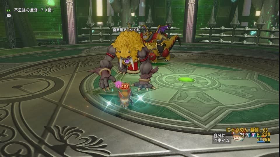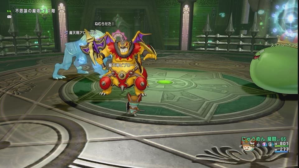 敵は2体いますがスライムベホマズンのツボの″お休みタイム″の効果で魔天剛アロゲイルは眠ってしまうので基本1対1の戦闘となります。ビブローンはHPが50%を切るまでは魔法攻撃を多用するので魔結界で無効化し大地裂きを警戒しつつアロゲイルを起こさないよう単体攻撃をします。