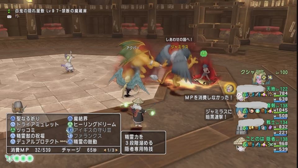 最後は隠者さんがひっさつを引いてその後は何事もなくお題もいつの間にか全部達成してのクリアとなりました。私は最初弓を装備して「お題の達成を狙いつつキラポンで援護」なんて事を考えていましたが甘かった…回復職は己の生存に全振りの立ち回りをするべきでした。※しずくを使ってしまったけどこういう時こそベホマズンなんだナ。