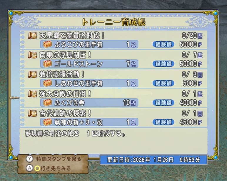 トレーニー育成帳は古代遺跡の探索(ゼルメア1回クリア)しかやらないよ! 南東の浮島征伐(輝きの草原)はスラボーグ、天星郷で物質系討伐は黄金の試練場⇨忘却の神殿に生息するあらなわ明神がオススメです。