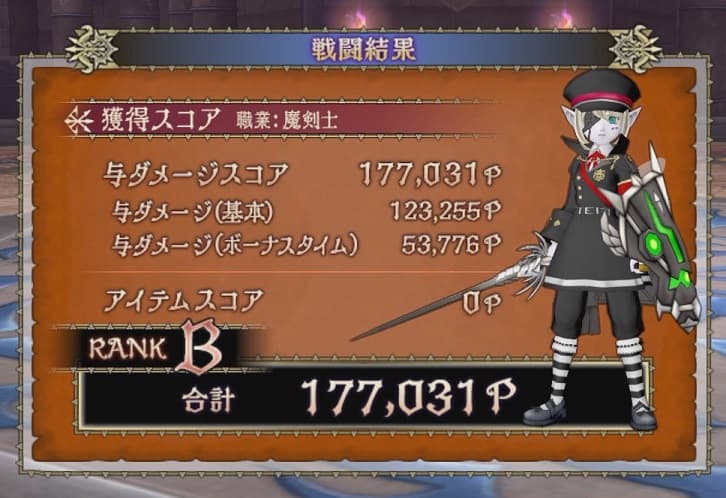 やったー! ってこれは闇のヴェールを使うのが遅くて黒炎帝の斬撃が間に合わなかったパターンだよ。黒炎帝が入れば20万PでAランクだったよ。ちなみに片手剣を鎌に変えればもっとポイントが稼げるよ!