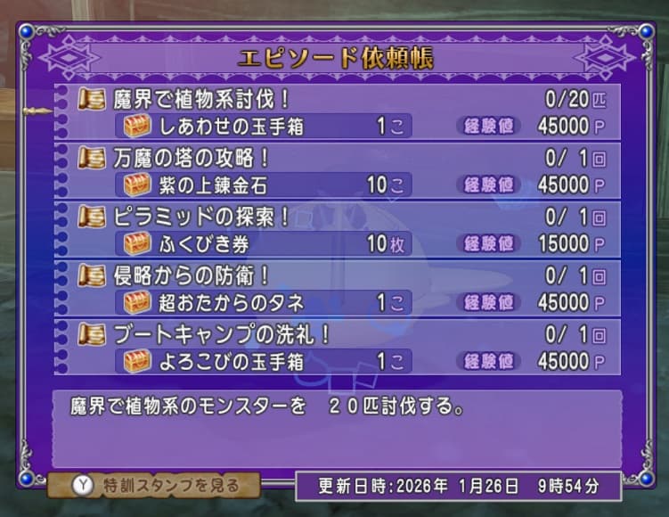 エピソード依頼帳は万魔の塔の攻略!しかやらないよ! 魔界で植物系討伐は、ゼクレス魔導国⇨ガウシア樹海入口付近に生息するおばけキノコか、ゲルヘナ周辺⇨ベルヴァインの森関所⇨ベルヴァインの森に生息するおばけキノコ、じんめんじゅ・強がおすすめです。