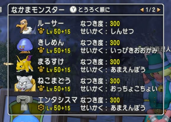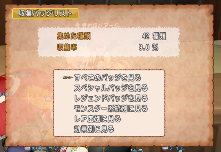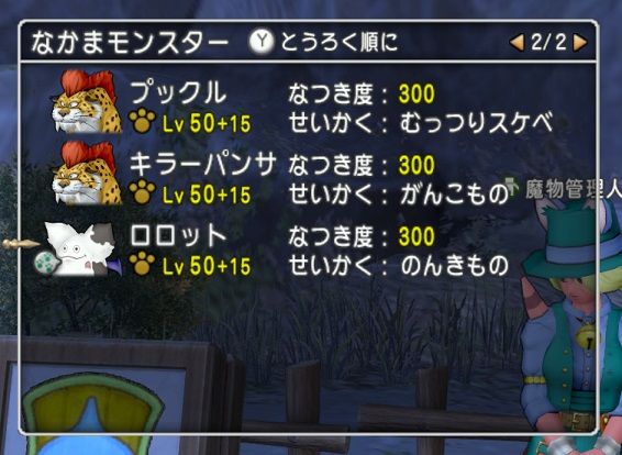 という事でサブキャラのにゅうめんで挑戦するモンスターバトルロードなのですがイバラの道です。モンスターのレベルとなつき度だけはMAXだけどバッジは全然なくて収集率はなんと9%。装備面はそれなりで状態異常耐性だけは充実しているのがせめてもの救いでしょうか。