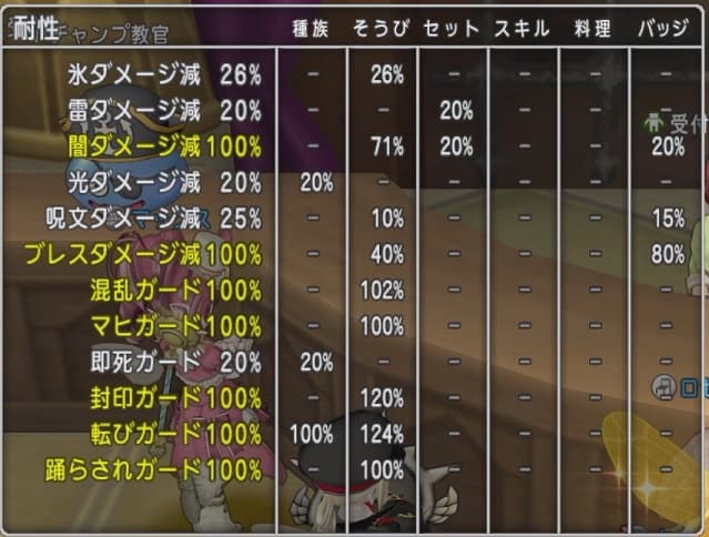 装備に呪文やブレス耐性を盛ったりセット効果で闇耐性20%が付くオスクトルローブや氷闇の月飾り、炎光の勾玉などを利用するとバッジを使わずに耐性を盛ることが出来ます。で、こんな感じ⇧になりました。うむ。ちなみにャンプで回避する必要のあるダイダルクラッシュ対策にふわふわボディのスキルを取っております。