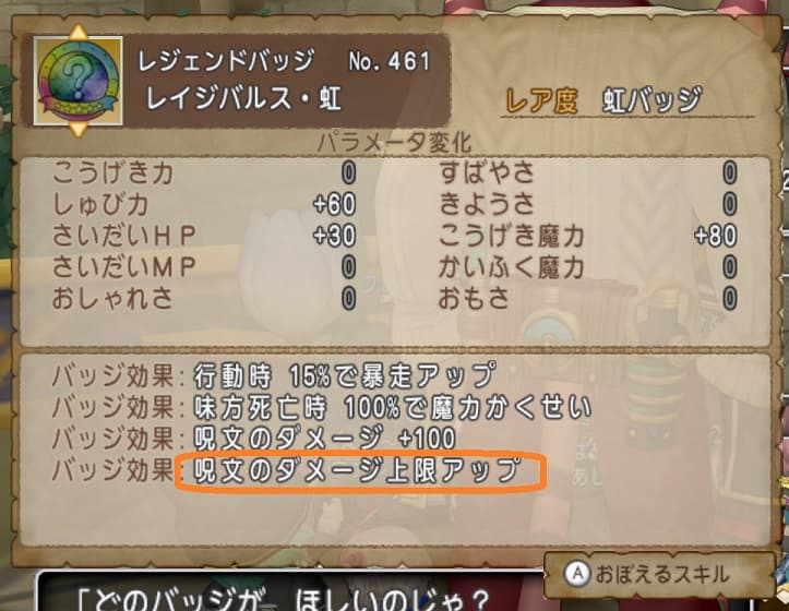 そして与ダメについてどうこう言うならば与ダメも低い。モンスターの魔法攻撃にはダメージキャップがあってメラゾーマの場合3999ダメ以上は出せないようになっているのです。ただしレイジバルス虹バッジがあれば話は別です。