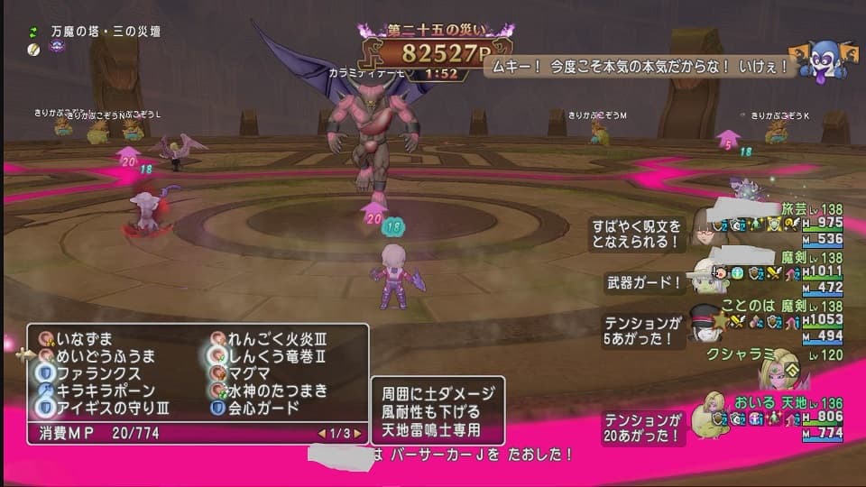 このあと2飯、練習パーティーと普通パーティーでの戦闘をしましたがやはりきっちりダメージを出すには貪欲に黄色の床を無理して渡ってでも攻撃を当てに行く姿勢が大事だなと…画像を見ると別にわざわざ黄色い床を渡らなくても普通に攻撃は当てられそうですが…とにかく! 越えられない床を眺めて立ち止まっていてはダメなんです。難しいですが。