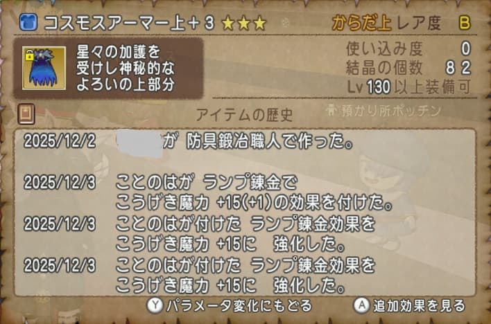 私が倉庫を漁っていて一番分からなかったのはコスモスアーマーの上下に攻撃魔力が付いた装備です。コスモスアーマーは現時点では最新の装備のはずですが何のために購入したのか、どころかそもそも購入した記憶すらないという摩訶不思議な存在となっています。鎧職で攻撃魔力? しかも履歴を見ると攻撃魔力の錬金を付けたのは自分!?…ワカラナイワカラナイ。