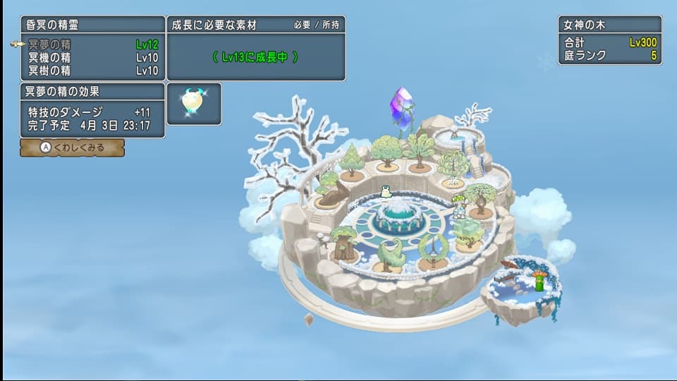 これで冥夢の精霊のレベルが13になりました…なります。残りの回復量アップと魔法ダメージアップは急ぎの用ってわけでもないしのんびりやります。