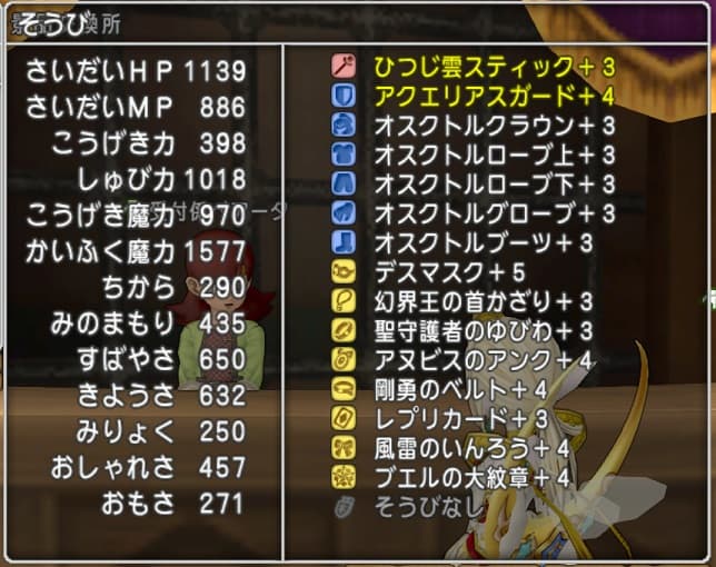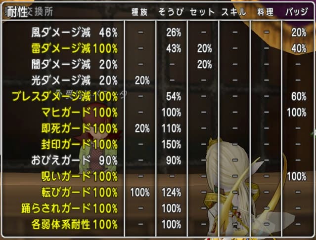 登場する強敵は常闇と聖守護者と深淵の咎人たちが多いように思えるので、ブレス、即死、呪い、マヒ、封印、踊り、転び、そしてなんと雷! まで100%耐性にしてやりました。ホイミンはふわふわボディなのでジャンプで回避が必要な攻撃も無効化出来るのでこれはかなーり強いです。