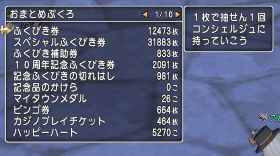 昨日は他にも40枚のふくのかみメダルを何度か買いましてふくびき券の総計はなんと12473枚!になりました。 今週のノルマ達成まであと少しという私としては珍しい?計画通りの進行具合でちょっと驚いております。