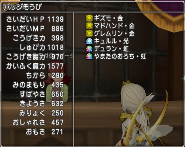 バッジはこんな感じです。ギズモ(雷耐性20%)、マドハンド(呪い100%)、グレムリン(ブレス30%)、キュルル(マヒ100%)、デュラン(雷耐性風耐性20%)、やまたのおろち(ブレス30%)。キュルルと魔仙卿バッジは仲間2人に装備させています。