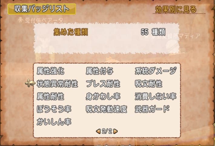バッジはこの項目から自分の装備に足りないものを捜して埋めていくだけです。地味だけどこれもまた楽し。仲間のモンスターの耐性を考えていると宝珠の有難みがホントよく分かります。